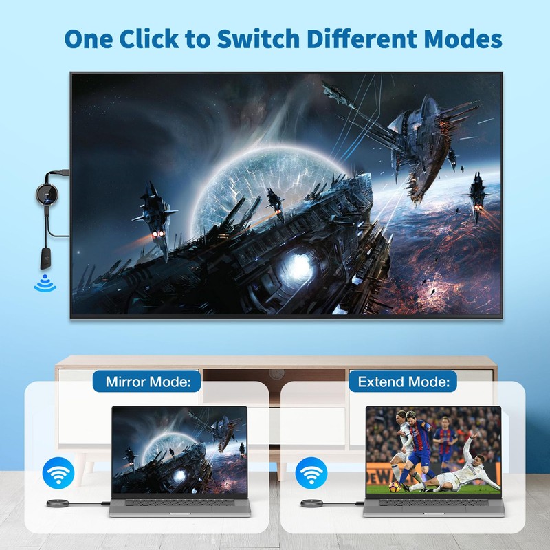 7.The wireless HDMI receiver can transmit 4K video from i-Phone, i-Pad, And,roid phone, tablet, window devices via Wifi mode to TV/ Monitor/ Projector
