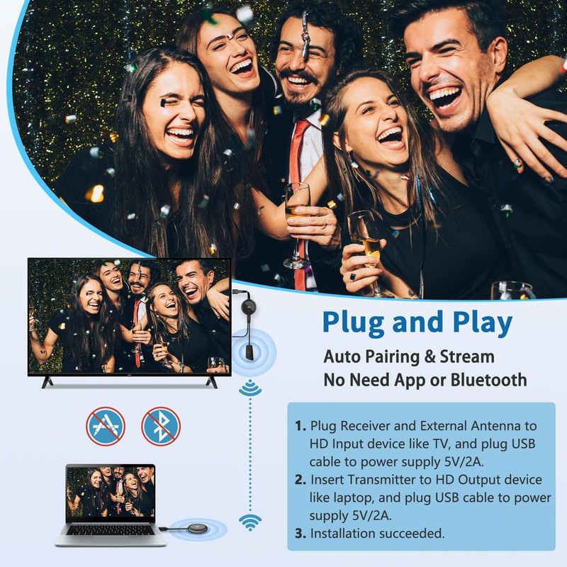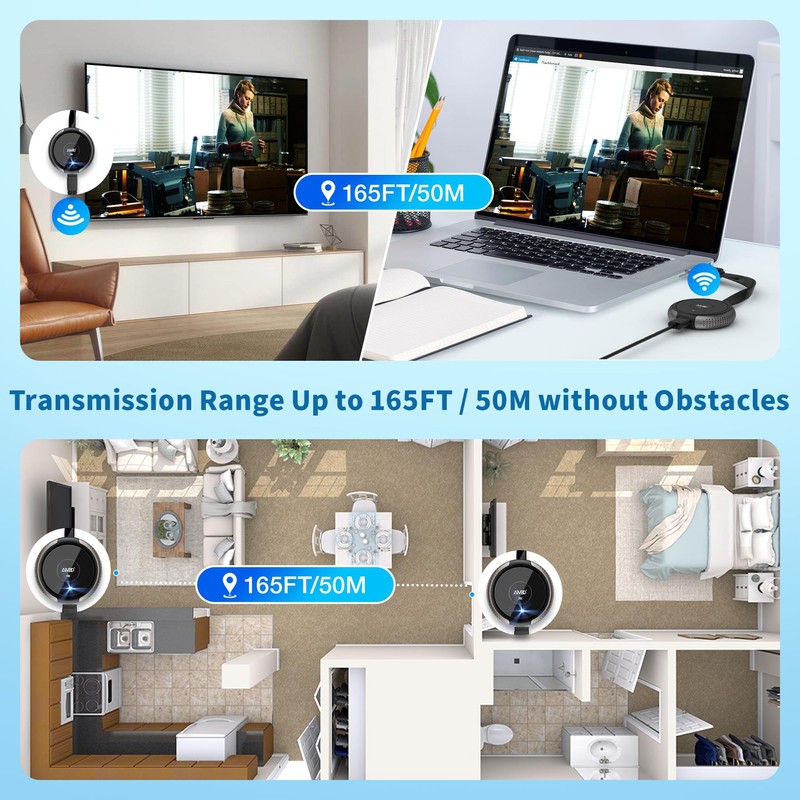 • 【Transmit Content Wirelessly up to 165ft/50m】Say goodbye to limited connectivity. Our HDMI wireless transmitter receiver gives you the freedom to move around. With its powerful signal, you can enjoy uninterrupted streaming from up to 165FT/50 meters away. [Note] Transmission distance and speed may be affected by crossing through solid walls.