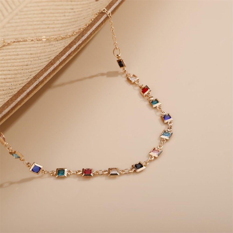 Aimimier Boho Dainty Gold Choker Necklace Crystal Inlaid Square Link Chain Clavicle Necklace Prom Party Festival Costume Accessories for Women Girls, 15.4in, Alloy, crystal, No Gemstone
