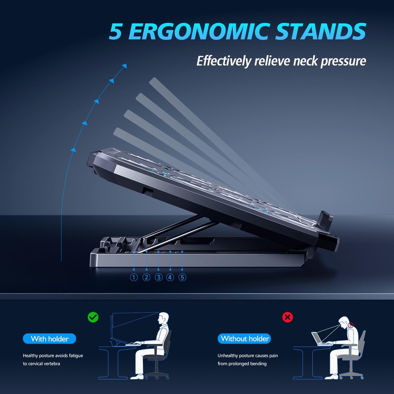 - Ergonomic Stand & Anti-slip BaffleThis cooling pad for computer laptop features a 5-level height-adjustable stand to relieve neck pain from prolonged use and incorrect posture, along with a retractable non-slip baffle to prevent sliding