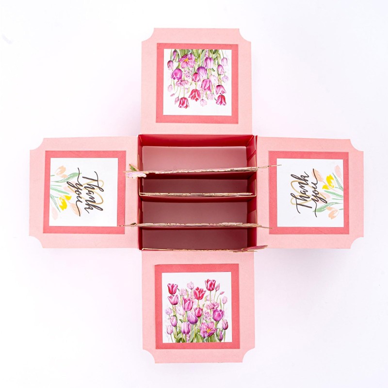 - DESIGN: Beautiful 3D pop-up card featuring pink tulips, butterflies, and delicate floral arrangements that create a stunning dimensional display when opened