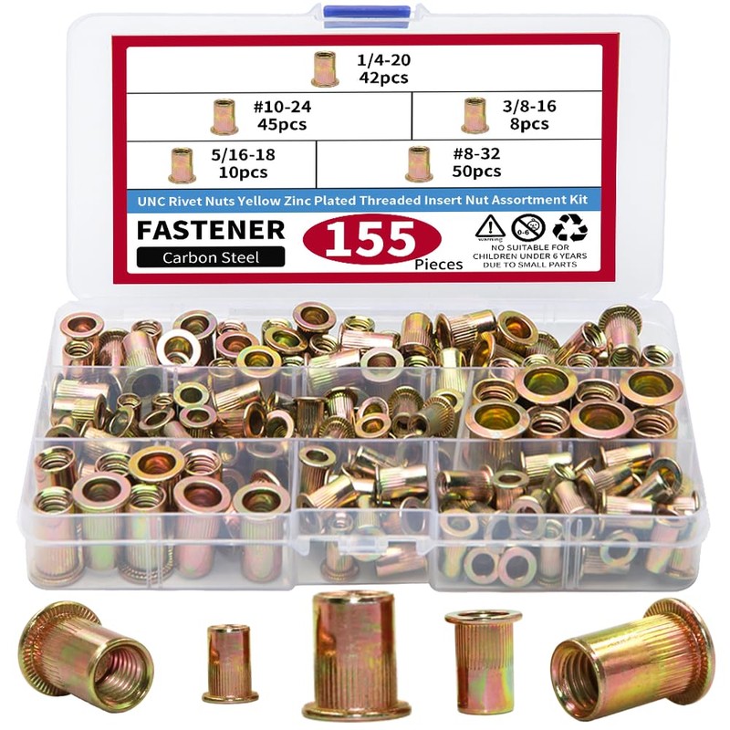 - 【UNC Rivet Nut】UNC rivet nut assortment kit contains 5 size types of rivnut, which are #8-32(50 pcs),#10-24(45 pcs),1/4"-20(42 pcs),5/16"-18(10 pcs),3/8"-16(8 pcs),5 different sizes to meet different sizes to meet different scenarios