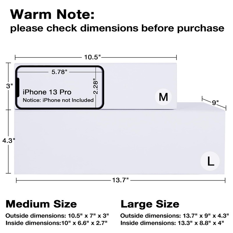 - Valuable 3 Pack White Gift Boxes - boxes are shipped flat; medium white collapsible gift box with magnetic closure, assembled box outside dimensions 10.5x7x3 inch, inside dimension 10 x 6.6 x 2.8 inch.