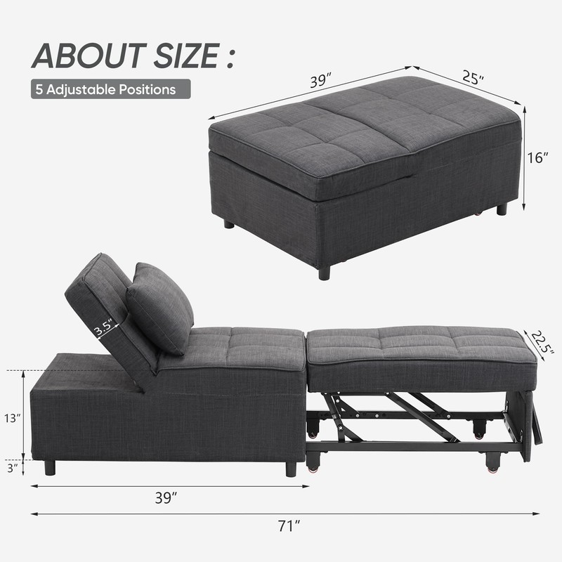 - 4 in 1 Multi-functional Convertible Sofa Bed: The convertible sofa chair works as a sizable chaise lounge, a futon sofa bed, a sleeper sofa chair, and an ottoman. Whether you want to sit, lounge, sleep, or serve as an additional sleeping area for guests, this pullout couch has you covered in any corner of your home. It is a great choice for small apartments, dorms, apartments, studios, offices.