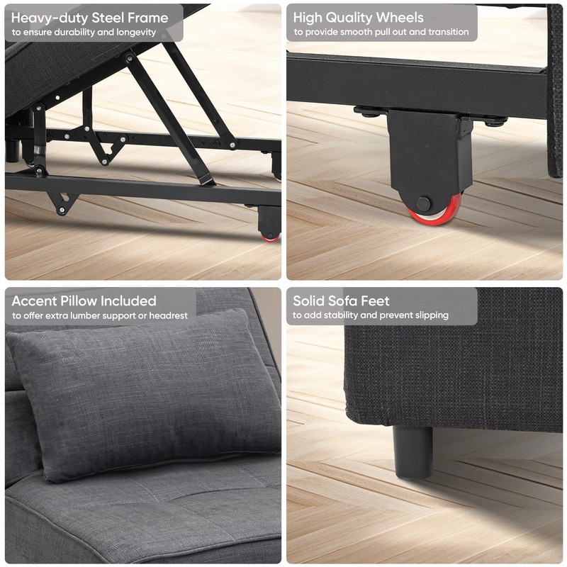 - Space Saving Design: The folding sofa bed has a space-saving solution that's easy to store, making it perfect for office naps or giving kids a place to rest when they visit. The futon sofa bed features wheels and a belt to help in pulling out. Due to this adaptable and folding design, The sleeper chair is suitable for any small space.