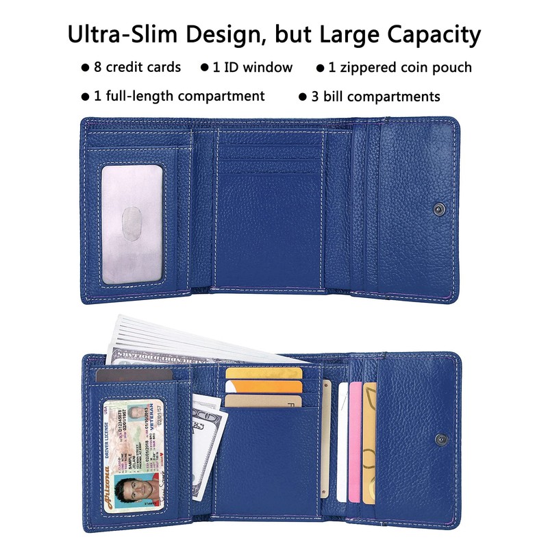 - Práctico: perfecto para mujeres que no les gusta llevar una cartera grande por la ciudad. Esta cartera de bloqueo RFID con bolsillo para monedas es delgada, pero el diseño transparente y el diseño triple es fácil de llevar los artículos necesarios mientras viajas, mantiene mucho sin ser voluminoso. Como la sección de facturas puede contener hasta 40 billetes de dólares, el broche permanece cerrado.