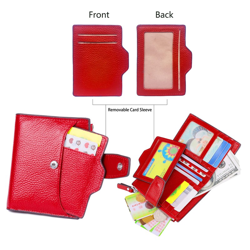 - GENUINE LEATHER - Made of high quality Cowhide Genuine Leather. Compact yet small enough to put into your coat pocket or your cross body bag. Comes With 9 Credit card slots and 1 photo slots, 1 coin pocket, 1 full-length compartments to put money, 1 removable card sleeve have 3 card slots. Roomy enough for fitting plenty of cards, change and some bills, coins, keep them well organized.