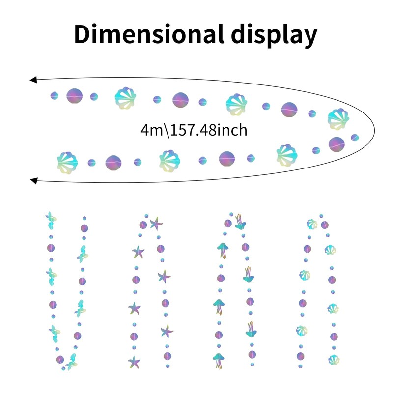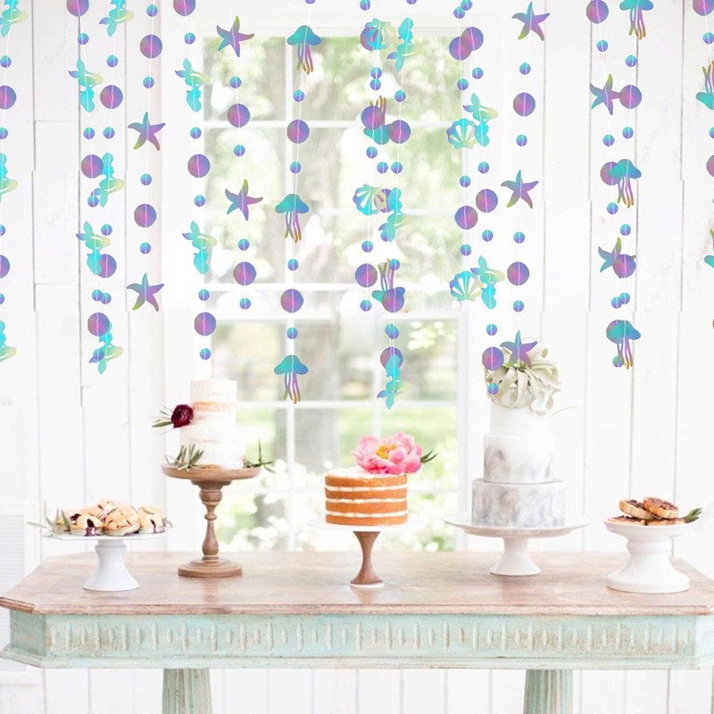 - Package includes: 4 mermaid garland streamers, including shells, jellyfish, starfish and mermaids, each garland is 13 feet / 4 metres long. The total length is 52 feet / 16 metres.