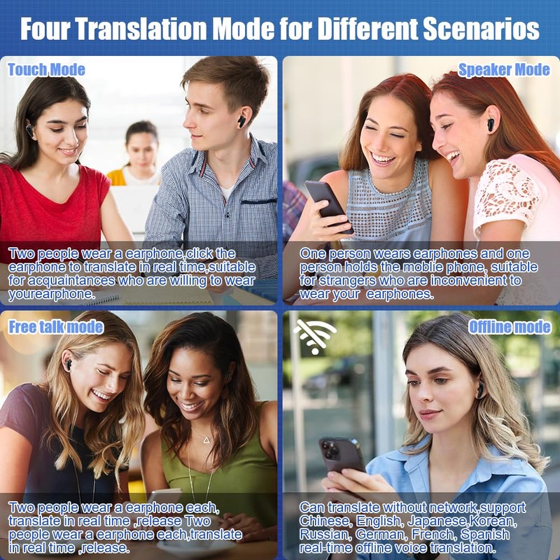 - 【3 TRANSLATION MODES】The translation headset has 3 modes: touch mode, hands-free mode, hands-free mode. Provides customized translation solutions for different scenarios. Whether you are attending a business meeting, exploring a new city, or need personal support, you can easily switch translation mode to improve your communication efficiency