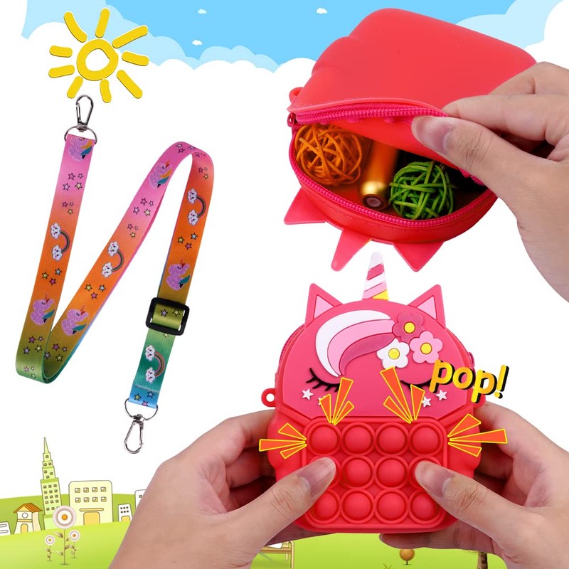 - Unique design: this pop push it bag is a combination of pop fidget toy and shoulder bag. It can be used as a bag that makes your hands free to store things, and can also be used as a press toy to enjoy the fun of pressing. The cute unicorn look is a popular design for children.
