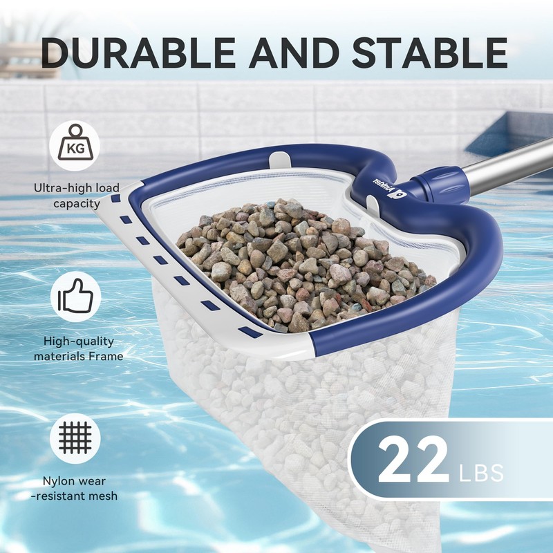 - [EVTENDED SERVICE LIFE]:Our pool net skimmer reinforced structural frame and premium quality nylon net bag provide the pool net skimmer longer lifetime.The robust structure of this pool leaf net allows it to hold up to 22 pounds of debris without twisting, bending, or breaking!