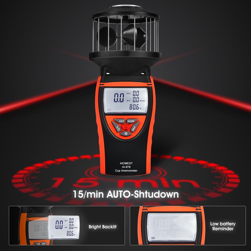 - Worry-free PurchaseHandheld anemometer AI-878 comes with 365 days quality warranty and lifetime technical supports. More features including: Max/Min/Average wind speed display, low battery indication, and auto shut down after 15 minutes without operation.