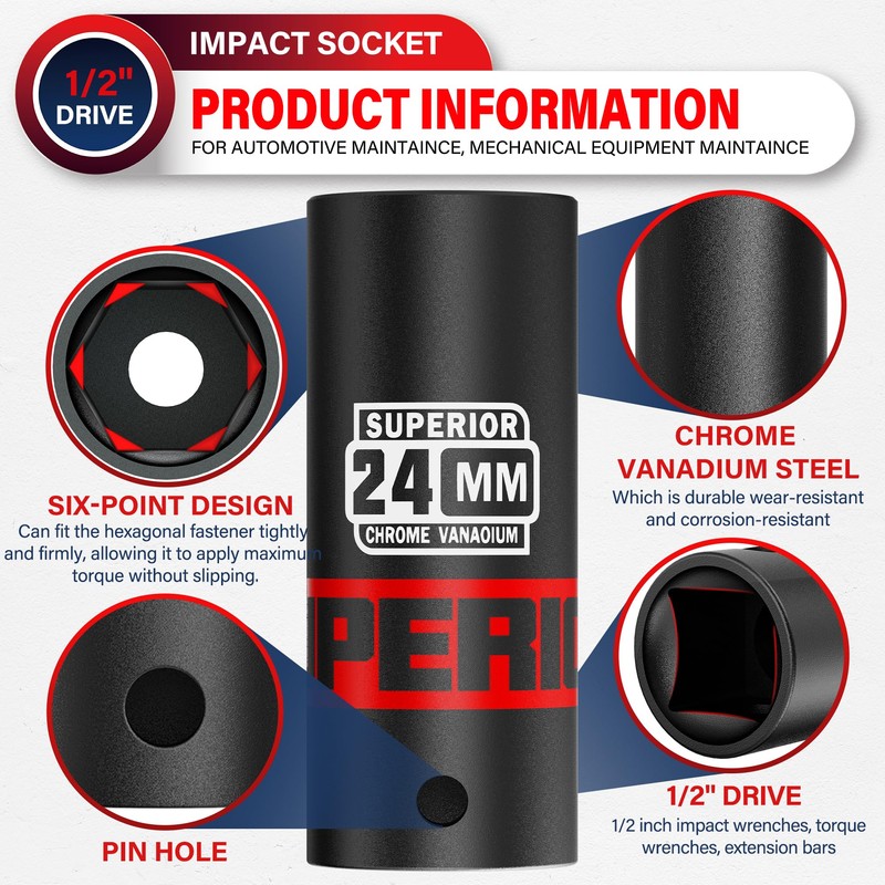 Aiourx 1/2" Drive Impact Socket, 24 mm Deep Socket, Metric, 6 Point, CR-V, for Car Repair, Loosen The Fastening Nut