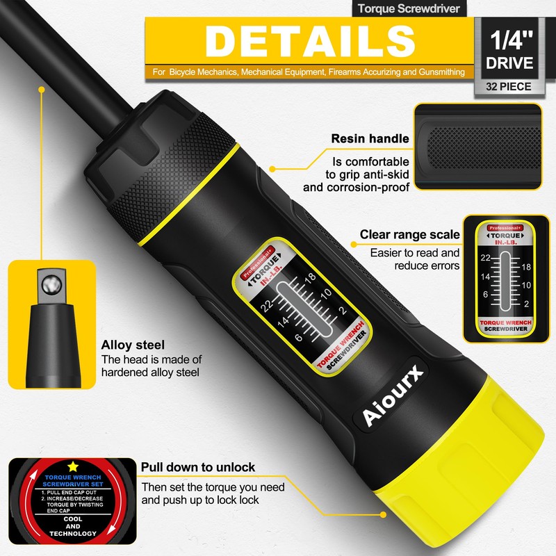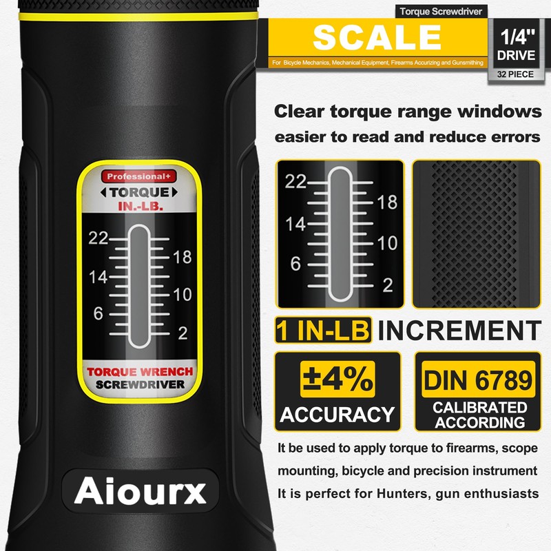 Aiourx Superior Precision Long Shank Torque Screwdriver Set, 2-22 Inch Pounds lbs, 2 in-lb Increment, 32 Pcs 1/4" Drive Torque Screwdriver Wrench with S2 Steel Bits for Bicycle repair, and Mounting