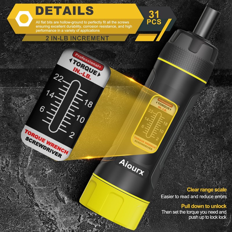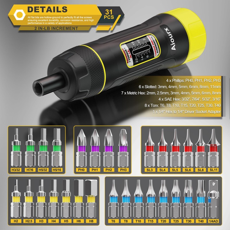 Aiourx Superior Precision Torque Screwdriver Wrench Set, 2-22 Inch Pounds lbs, 2 in-lb Increment, 31 Pcs 1/4" Drive Torque Screwdriver Wrench with S2 Steel Bits for Tools, Mounting and Bike Repairing