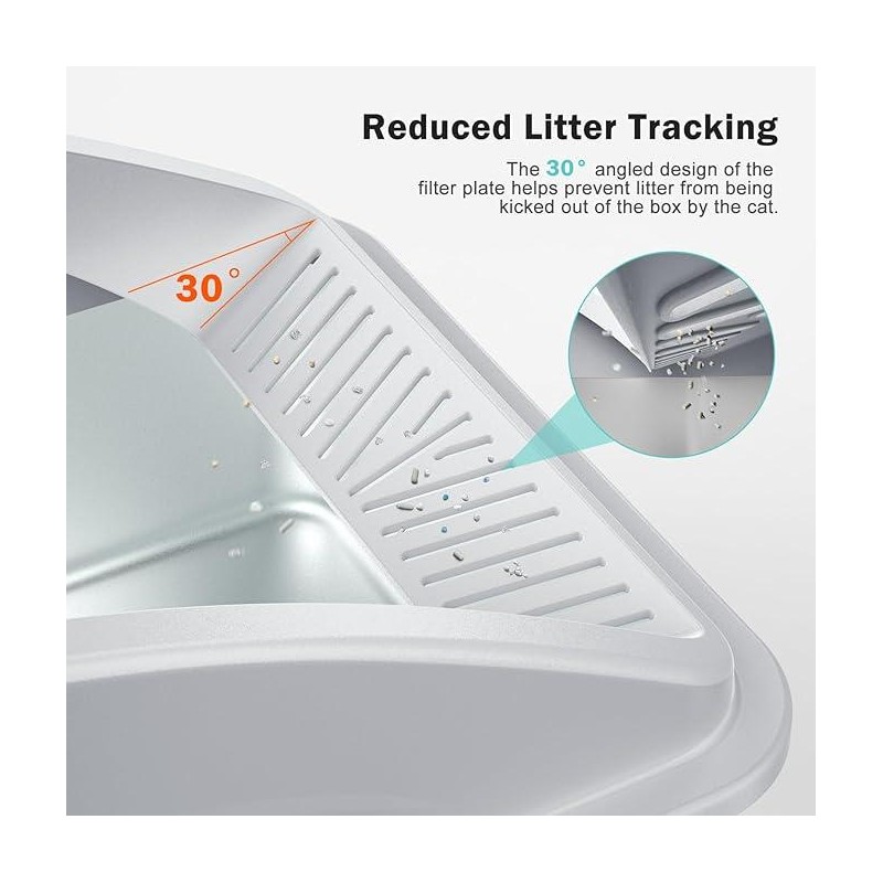 - The inclined design helps minimize litter tracking by preventing it from easily escaping the litter box.