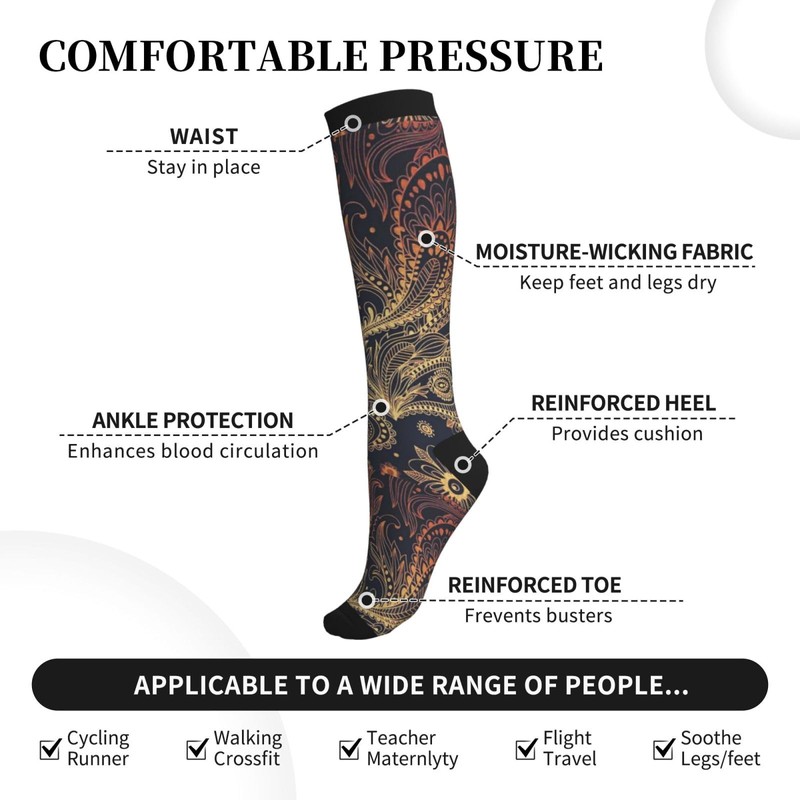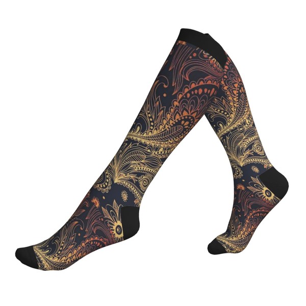 aipoase Gold Paisley Compression Socks Knee High Circulation Support Socks For Women Men Athletic Running Hiking Cycling
