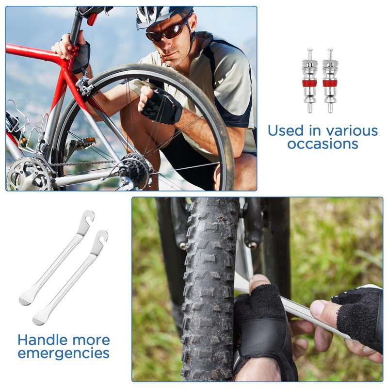 - COMPLETE BIKE ACCESSORIES Includes 64 tire repair tabs, 2 valves, 4 valve rubber strips, 2 metal rods, 4 metal throttles, 6 sandpaper tabs and 4 tire repair adhesives.