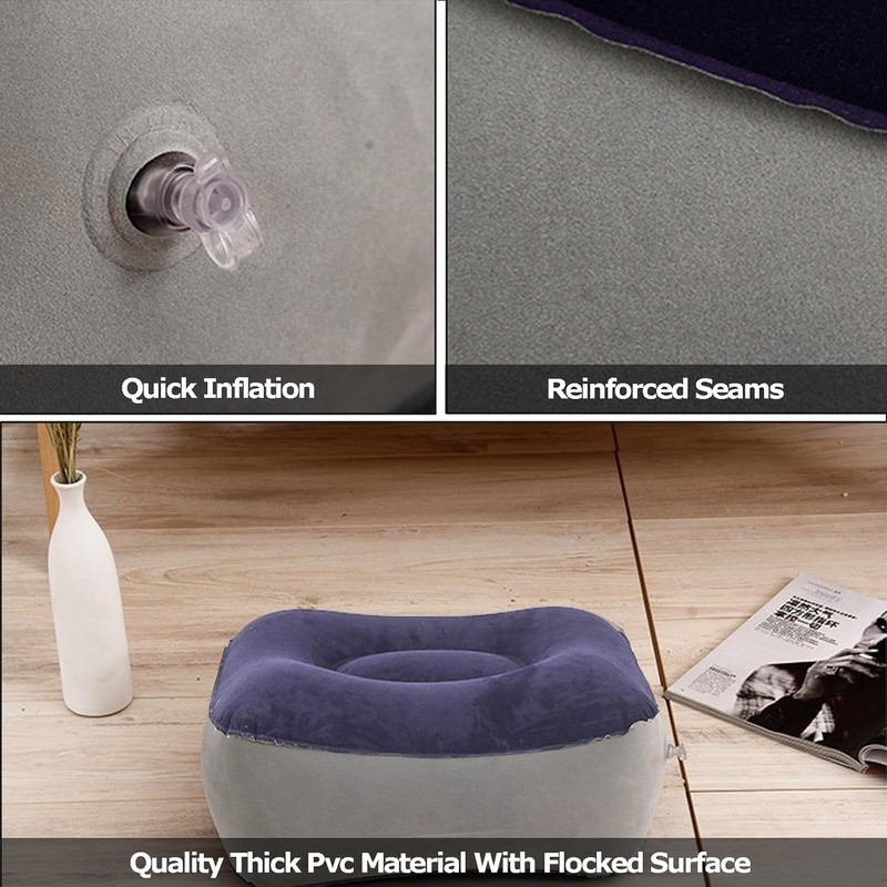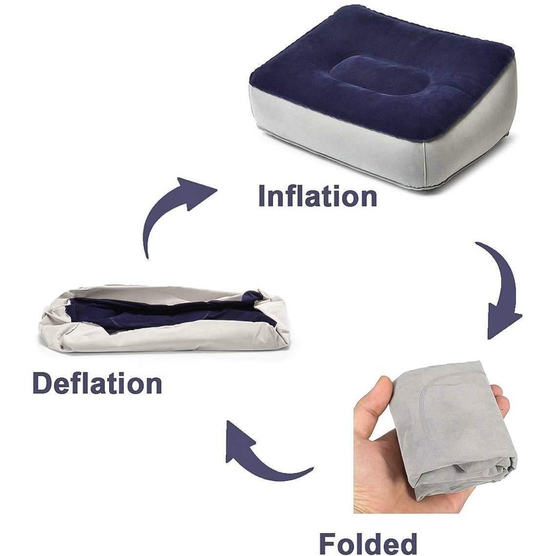 - Foldable: An air pump is attached to this term. The inflatable travel footrest can be inflated and deflated immediately, which allows convenient storage and space saving. Quickly unfolds for easy assembly and folds flat when not in use for storage.