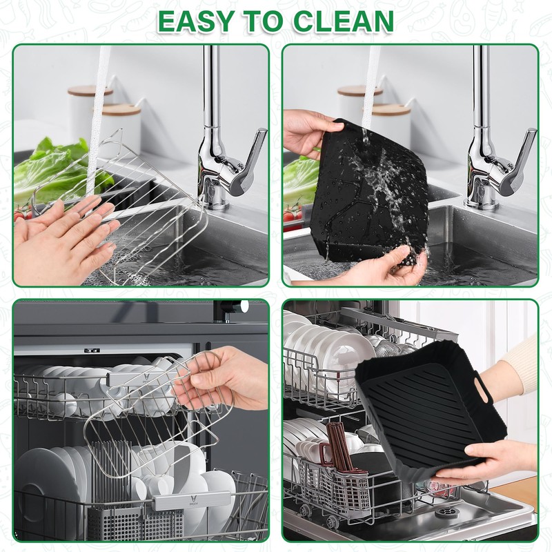 - Easy to Clean - Cleaning these silicone air fryer liners is a breeze. Simply flip them over and gently brush with warm water and dish soap to effectively eliminate oil residue, saving you valuable time and energy after each cooking session.