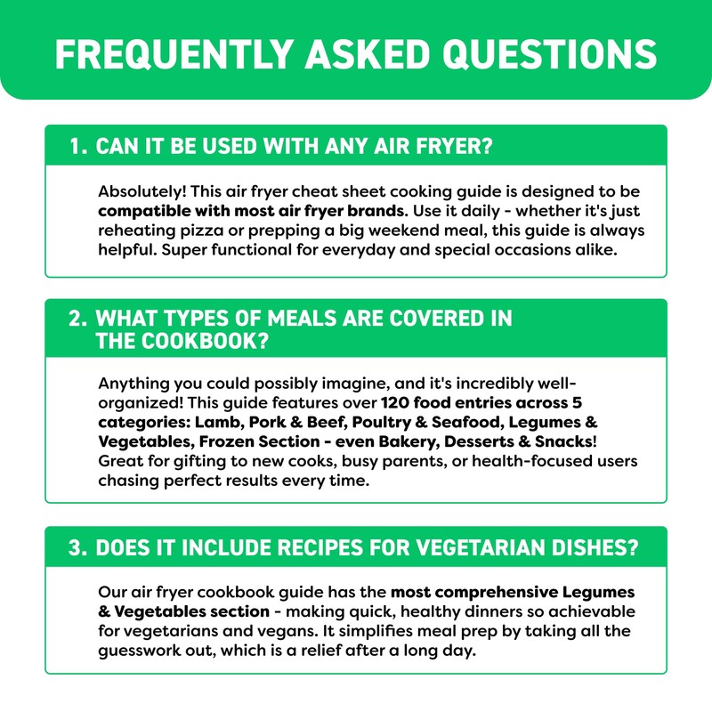 - Over 120+ food entries in 5 categories: Bakery, Desserts & Snacks, Poultry & Seafood, Lamb, Pork & Beef, Legumes & Vegetables, Frozen Section. Comprehensive Air Fryer Accessories. Well-researched accurate info at the flip of a finger so you can conveniently instantly find ideal cooking times without needing the internet.