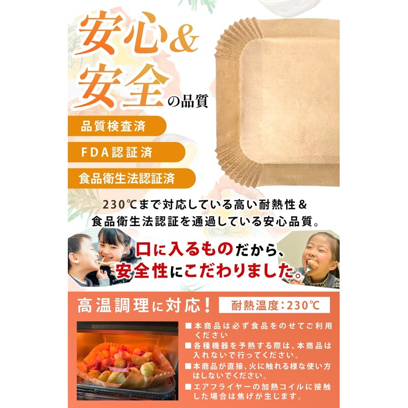- (Superior Quality and Safety) Food Sanitation Act Certification, FDA Certificate, Quality Inspection, and Safe Quality that has cleared all of our products. This air fryer sheet is waterproof, oil resistant, heat resistant, and can withstand high temperature cooking temperatures up to 230 degrees Celsius. Our parchment sheets are the first priority for the health of your children and your families