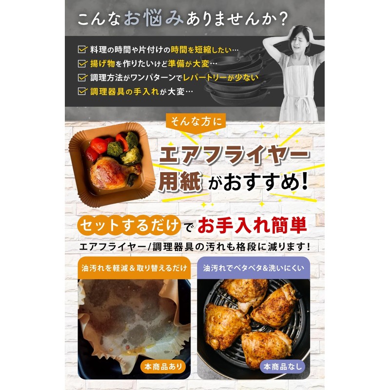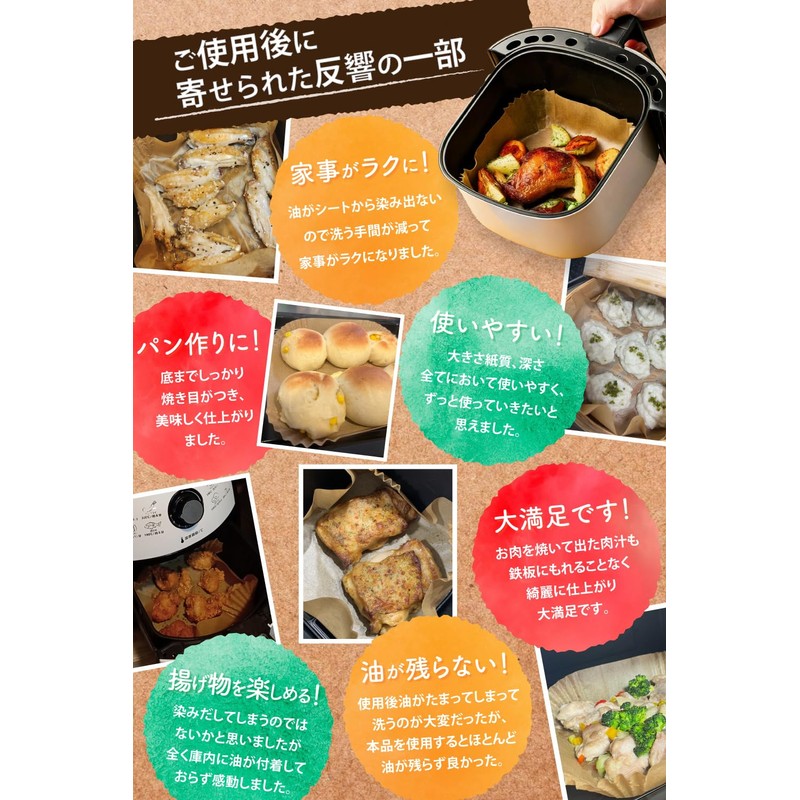 - (Supervised by a culinary research) By using air flyer paper, it minimizes the mess inside the flyer and greatly reduces the hassle of clean-up. The extra tall design prevents grease and juices from splashing out and helps keep them clean. Say goodbye to sticking and greasy stains! These sheets are easy to clean. Make cooking more fun!