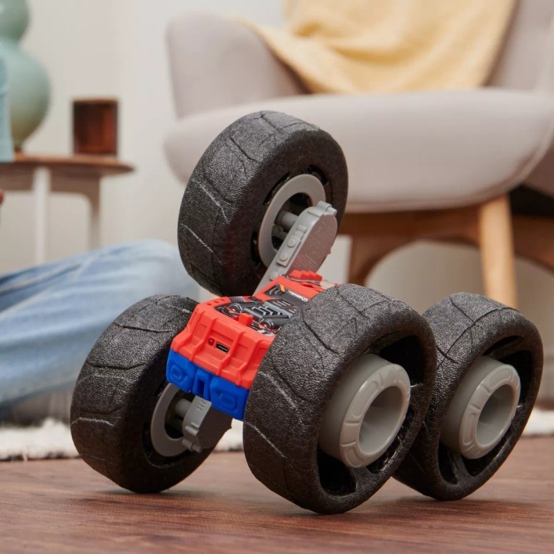 Disfruta de la estética del automóvil de color rojo, por un lado, o dale la vuelta para ver un elegante vehículo deportivo de color azul en un solo vehículo. Uno de los vehículos más increíbles para divertirse en interiores, con acrobacias, saltos y giros y sin necesidad de preocuparte gracias a los neumáticos suaves.