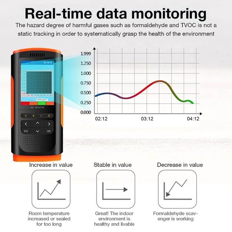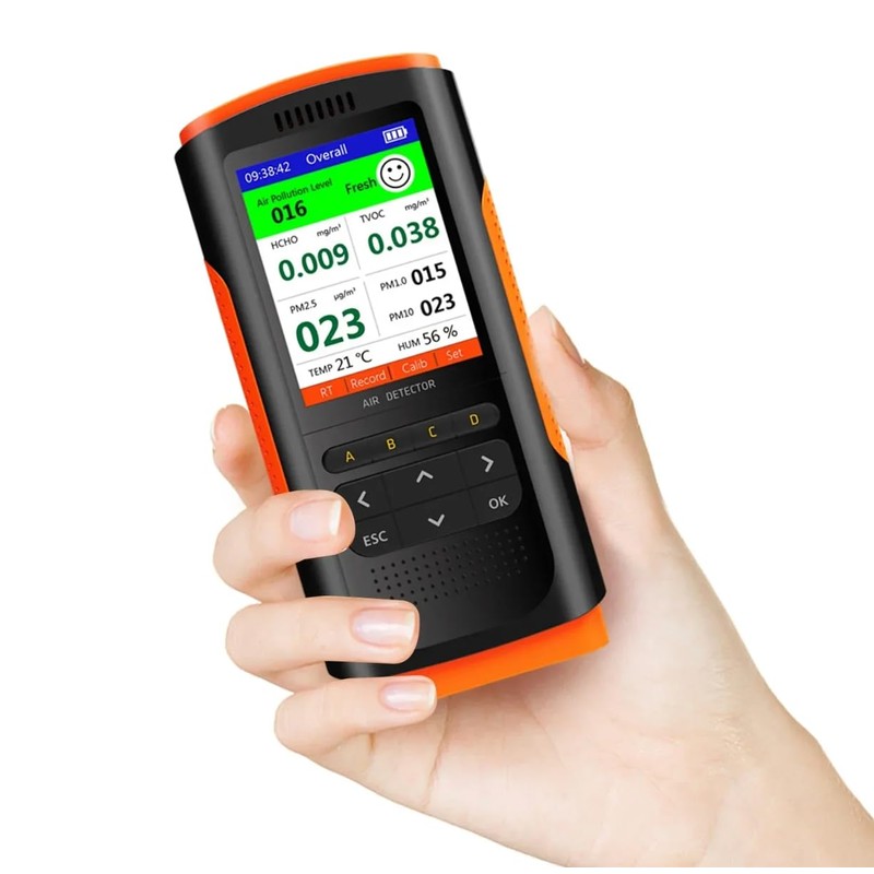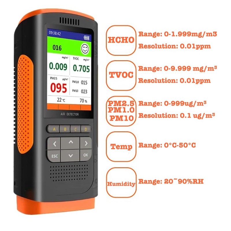 - Air Quality Monitor can automatically detect HCHO, TVOC, PM2.5, PM1.0, PM10, temperature and humidity, ideal for home, office, car and other indoor areas