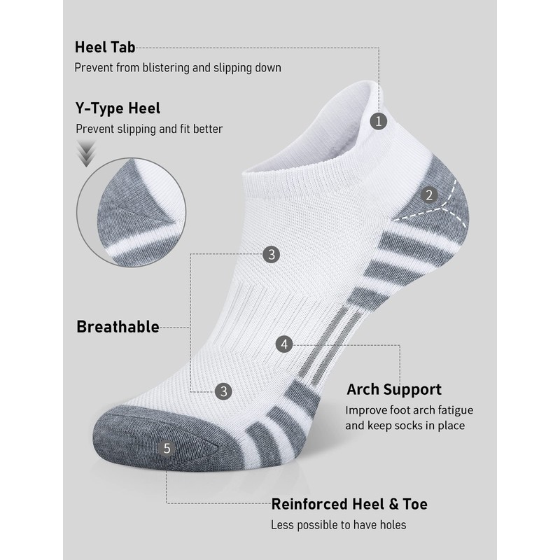 - Non Slip Off & Arch Support - Our low cut tab socks have suitable compression in arch to protect you when you walk, jog and run and increase stability for a perfect fit. Elastic cuff tab can lock the heel and make sure our sports socks non-slip in order to prevent athletic sock sliding from your daily walking, running, cycling, hiking, tennis, soccer.