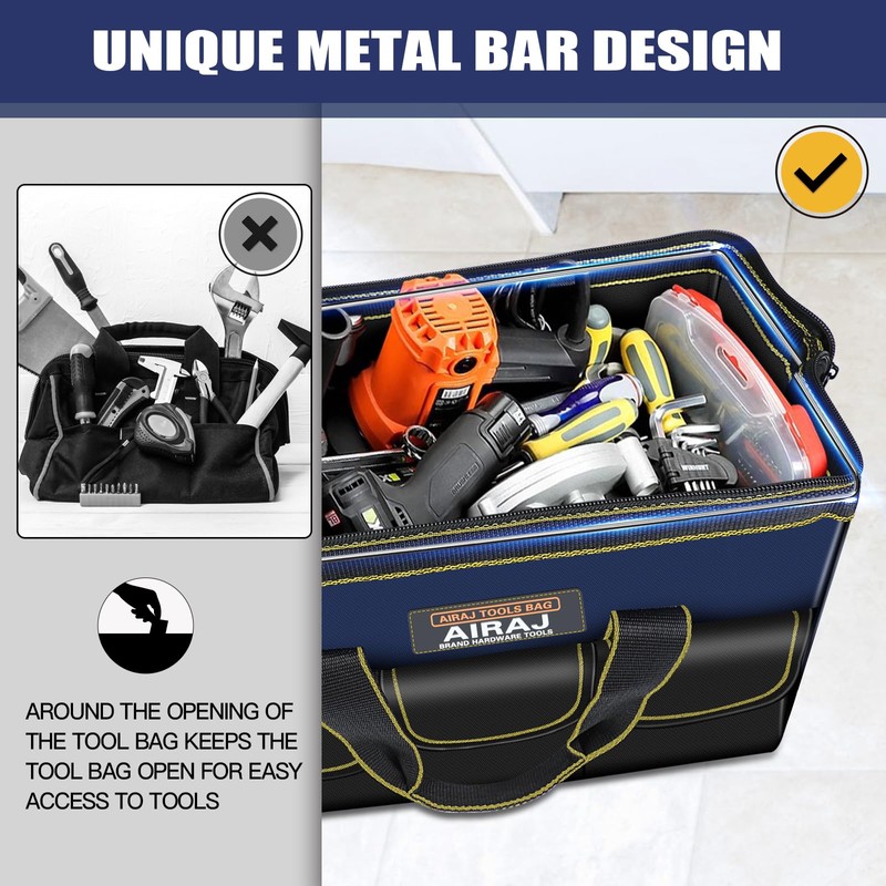 - Wide Open Mouth Storage Bag:The large opening at the top of the tool bag is designed with a built-in metal bar to keep the tool bag open at all times, making it easy to store and access tools and convenient to use.