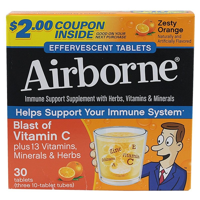 Airborne Effervescent Tablets provide immune support in a great-tasting formula*. Each serving (1 tablet) delivers a blast of 1000 mg of Vitamin C plus 13 vitamins, minerals, and herbs, including Echinacea and ginger. Adults and Children 14 years and older, simply drop 1 tablet in a glass of water or favorite beverage, let dissolve (about 1 minute) and drink. Can repeat every 3-4 hours, up to 3 times per day. Children 12-13 years old, repeat every 3-4 hours as necessary, up to 2 times per day; no more than 2 tablets. Gluten Free. Visit AirborneHealth.com to learn more. *These Statements have not been evaluated by the Food and Drug Administration. This product is not intended to diagnose, treat, cure or prevent any disease