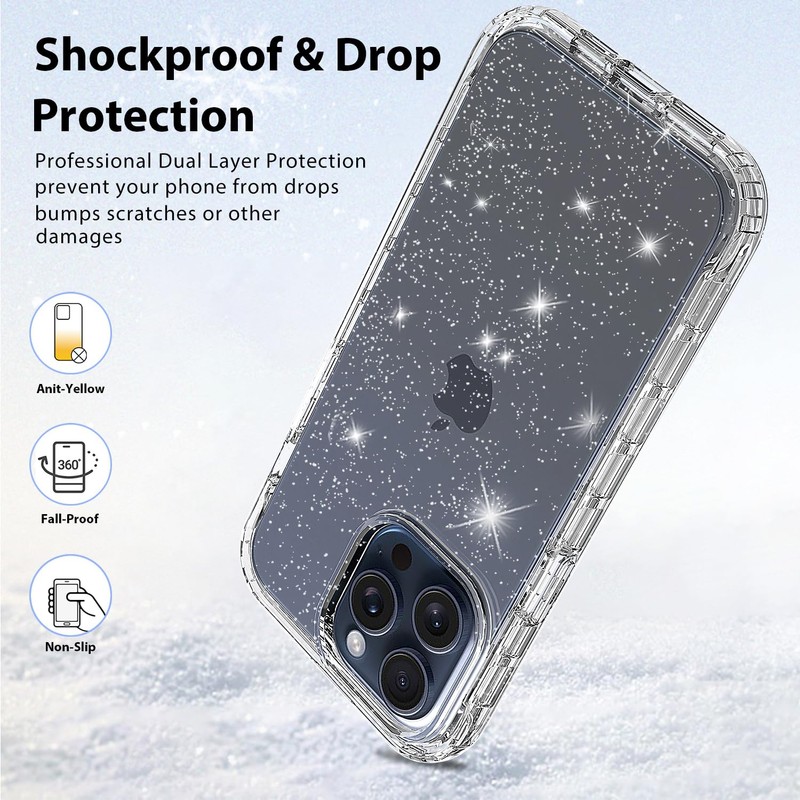 Fashionable Glitter & Lightweight The 15 pro max cover is made of professional eco-friendly anti-yellow premium TPU and rugged PC frame with stylish embedded silver glitter,not only can keep long-lasting clarity to show off the oringal beauty, but also get extra shinning look, the glitter will never flake off no matter how long use it.