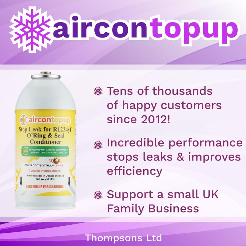 - Made In The USA. Accept no substitite - Aircontopup is the original and best DIY recharge system. Completely safe to mix and fully compatible with original refrigerant. Supplied with instructions. You Receive: 2x113g Leak Sealer equivalent to 456g of R1234yf + 1xProfessional Type Hose & Gauge (R1234yf)
