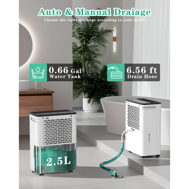 • 【Manual & Auto Drain Options】The 2.5L/0.66-gallon water tank comes with a full tank indicator. Additionally, it offers a continuous drainage option with a provided drain hose(6.56 ft). This allows you to connect it directly to a sink or drainage outlet, perfect for long-term and unattended use.