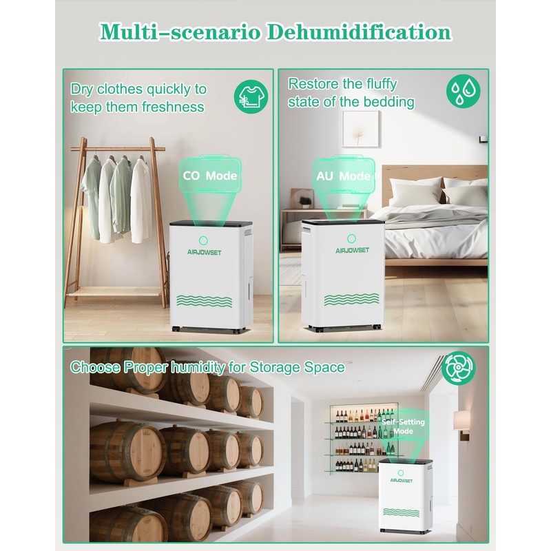 • 【Multiple Dehumidification Modes】CO Mode: Continuous dehumidification,AIRJOWSET dehumidifiers can set humidity(30%-90%RH in 5% increments). AU Mode: Automatically select the set humidity according to the indoor temperature.