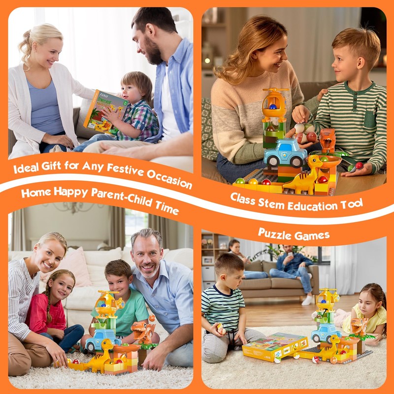 - Marble Maze for Toddlers Ages 4-8: As an innovative marble track + building block toy set, this set of compatible building blocks Can be changed variously to suit different entertainment scenes, 2 dinosaurs, cars and helicopters have different functions to play, there are 4 pre-designed challenges in the instruction manual, this is a great interactive toy set, whether it is parents and children playing together or children playing with friends