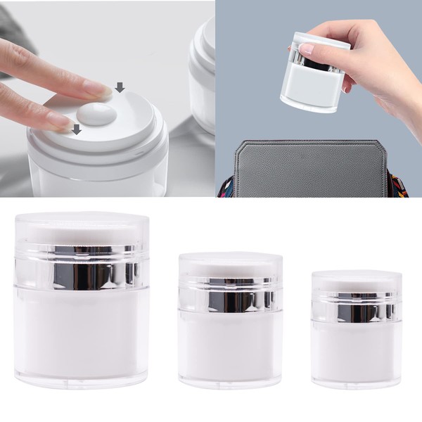 - Box contents: the package includes 3 x airless pump jars (15 ml + 30 ml + 50 ml). This refillable vacuum cosmetic container is ideal for travel, business trip, camping, etc.Can be used to fill with shampoo, lotion, shower gel, creams, cosmetics, etc. Lightweight and easy to carry.