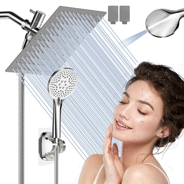 Transform your daily shower into a spa-like experience with this luxurious dual showerhead system. The oversized square rainfall showerhead delivers a full-coverage cascade of water, while the handheld unit offers targeted spray patterns for versatile use. The matte black finish adds a modern touch to any bathroom decor. The innovative design features a generous 8-inch overhead panel with multiple spray nozzles for consistent water flow and pressure. The adjustable handheld unit includes multiple spray settings and a comfortable grip. Installation is straightforward with the included mounting hardware and adjustable bracket. The extended hose provides excellent reach and flexibility for various showering needs. Both showerheads can be used independently or simultaneously, depending on your preference. The durable construction and high-quality materials ensure long-lasting performance, while the easy-to-clean nozzles prevent mineral buildup. Perfect for families, this shower system accommodates users of different heights and provides a customizable showering experience.
