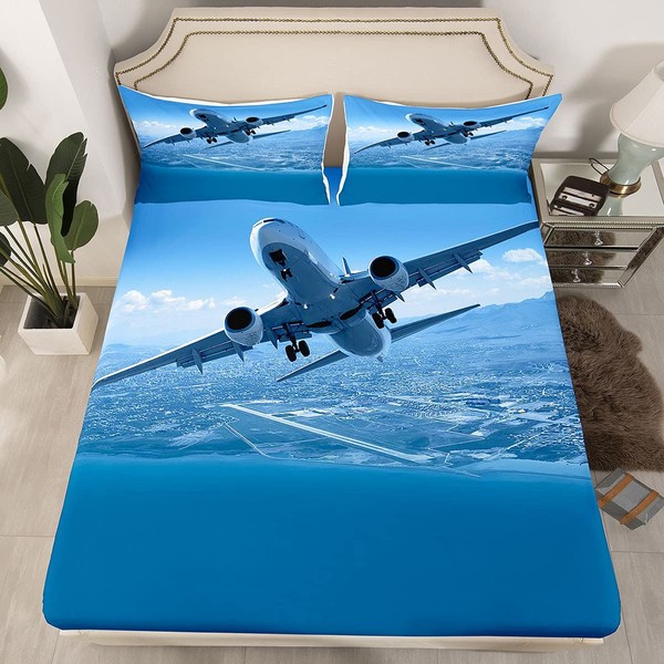 Airplane Bedding Sheets Aircraft Bed Sheet Set for Kids Boys Girls Blue Sky Flying Airplane Bedding Fitted Sheet Novelty Modern Bed Cover 3Pcs Double Size