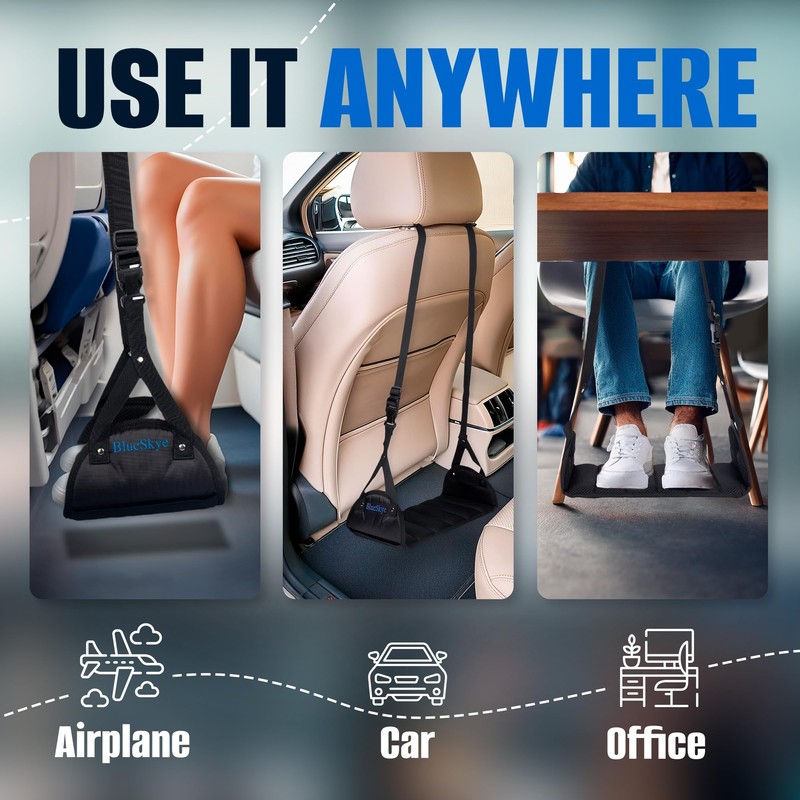 - Travel in Comfort - Our footrest elevates your feet, improving blood flow and relieving pressure from key areas like your lower back, ankles and feet, promoting comfort and better posture. Whether you're sitting at a desk for long hours or frequently traveling on flights, the BlueSkye airplane footrest is designed to ease discomfort.