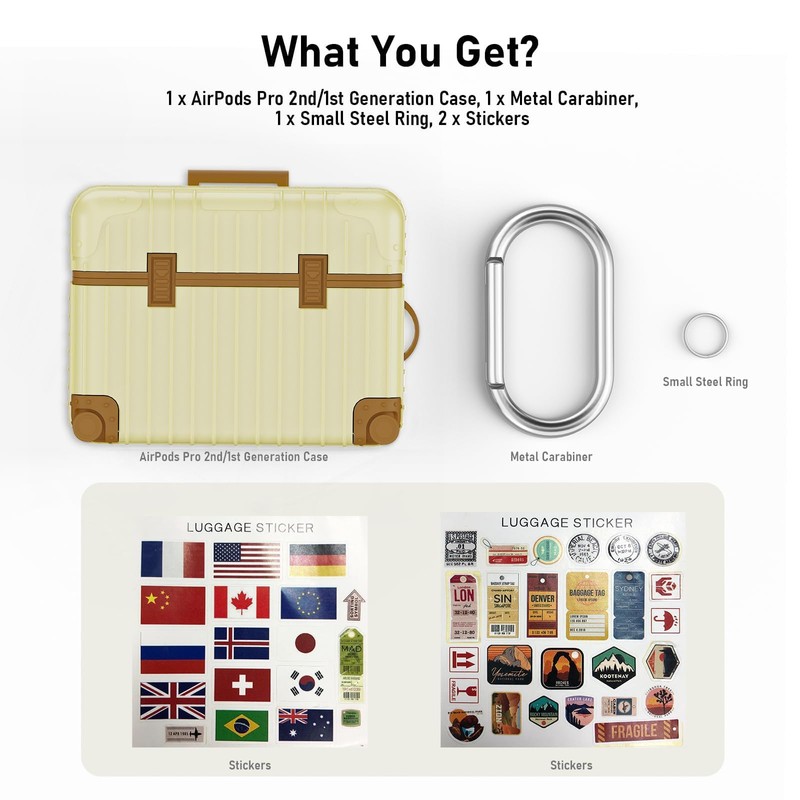 - 【What You Get】1x Suitcase Case for Airpods Pro 2nd Generation/1st Generation, 1x Metal Carabiner, 1x Small Steel Ring, 2x DIY Stickers. Please note that AirPods Pro & AirPods Pro 2 Charging Case are NOT included.