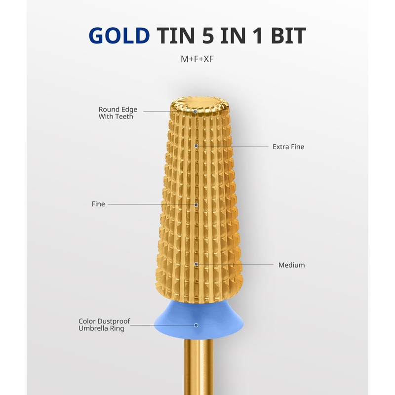 AIRSEE Tungsten Carbide 5 in 1 Acrylic Nail Drill Bit Efile Electric File Machine Head Tip for Manicure Polishing Fast Remove Gel 3/32" Shank 2 Way Professional Tech Use Gold TiN Medium-M+F+XF