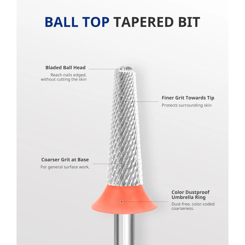 - Shape: Ball Top Tapered Bit: The drill bit is rounded at the top with the tapered shape body to protect the cuticles and side walls from scratches and cuts upon contact.