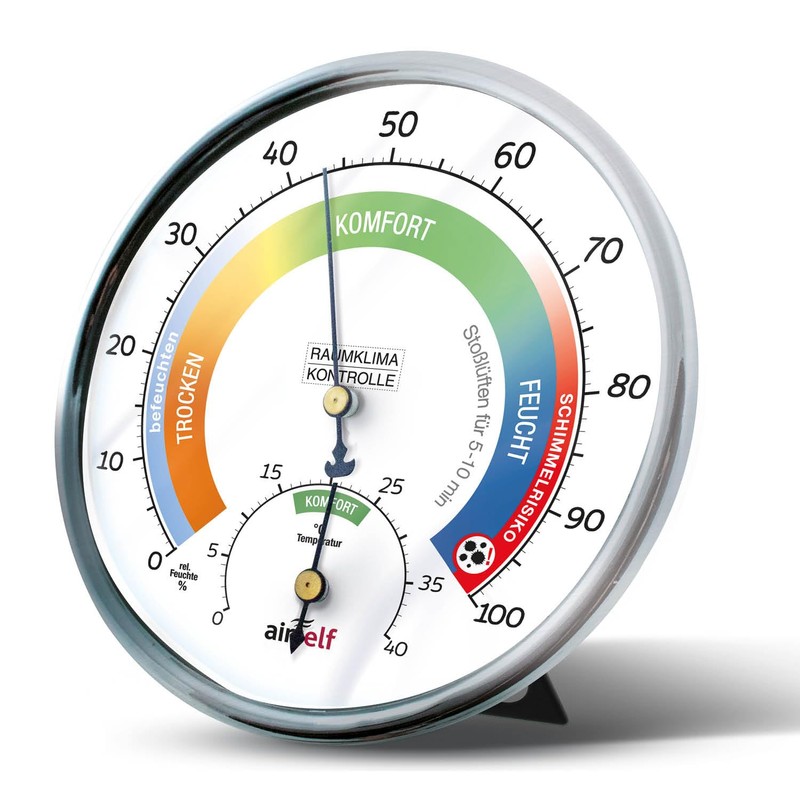 This analogue thermohygrometer helps you with permanent, easy monitoring of the climate in a room of your choice (e.g. kitchen, bedroom, bathroom, children's room, office, holiday home, etc.). Control the humidity and temperature in the room regularly with the airself thermohygrometer. The particularly clear design of the dial with comfort zones and remedy tips makes it easier for you to create a cosy living environment. Details of the airself thermohygrometer: large measuring range of 0-100% humidity and 0-40°C temperature; unique design of the dial: coloured zones mark the humidity areas dry, comfort and moist; recommendations for action on the dial show you how to improve the indoor climate immediately; red marked "mould alarm" indicates increased risk of mould; clear, good. readreadreadable numbers for Reading, no battery required, hanging or standing (stand included), includes informative booklet with lots of relevant information and tips. Technical data: Size: approx. 125 x 70 mm; weight: 125 g. Why a thermohygrometer? The right humidity and temperature indoors are crucial for a healthy living climate. Too high or too low humidity can have a negative effect on well-being and health. Affected are the skin and respiratory tract, which suffer from an unfavourable indoor climate (asthma, (house dust mites) allergy, susceptibility to infection). A thermohygrometer is also a useful and helpful tool for preventing mould infestation indoors.