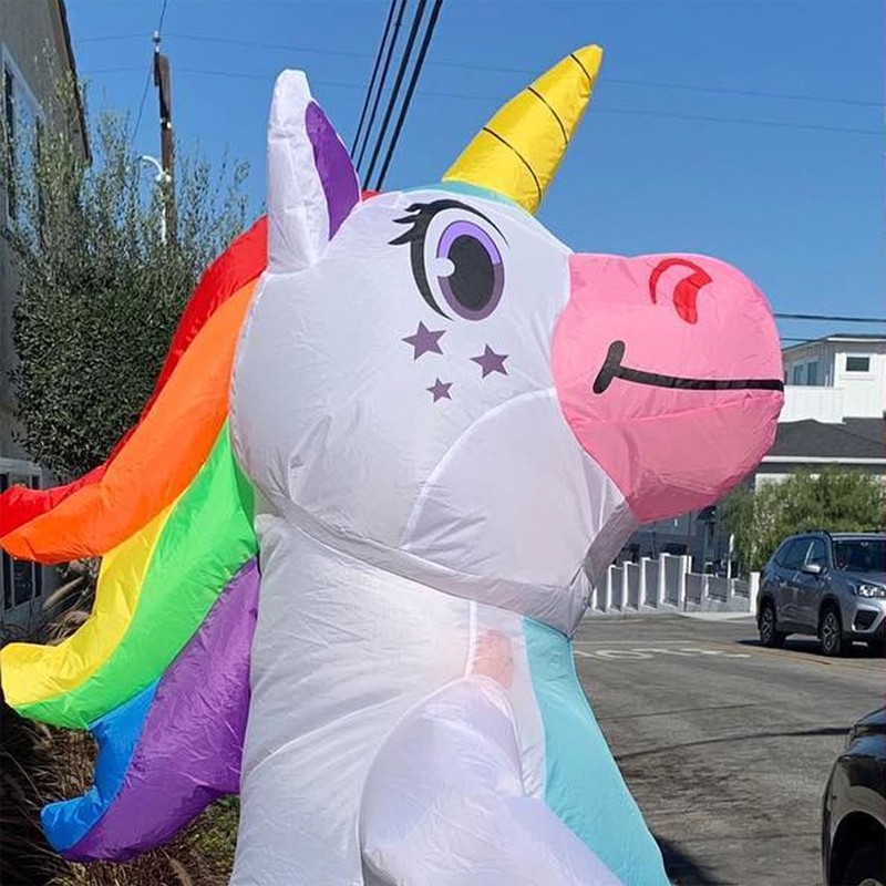 - Inflatable: Giant inflatable unicorn costume. Easy to inflate thanks to the 2 built-in fans powered by batteries (type AA, not included).