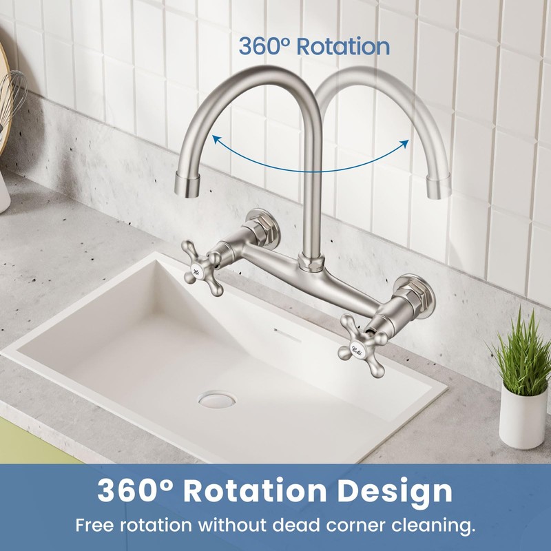- [Design]:The Spout designs with 360-degree swivel which rinses to every corner of the sink,The commercial kitchen faucet has 2 installation methods with adapters which you can choose wall mount or commercial sink mount.