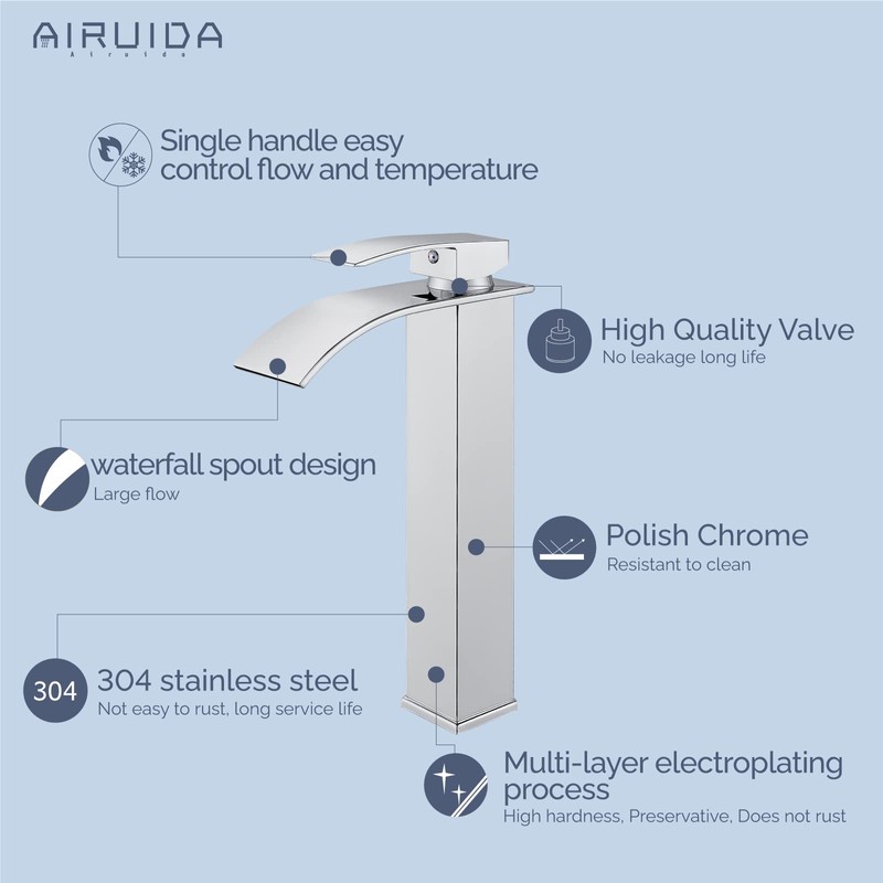 - [Design]:The ultra-wide tall waterfall spout design make large water flow. Chrome Polish finish resist corrosion and can prevent tarnishing, highly reflective. Single handle easy control flow and temperature.