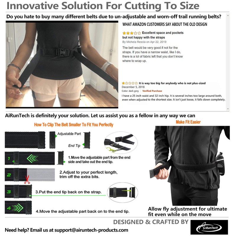 - ANTI-SLIP TECHNOLOGY FOR ULTIMATE FIT AND FRICTION-FREE COMFORT : AiRunTech Upgraded run belt hook&loop tape's in place nicely and doesn't loosen while running, give you the ultimate freedom of movement and comfort, personalized fit for hips from 18-51.2 inch (46cm-130cm), Designed to be worn low down on the hips, contoured grips ensure total comfort by removing friction, allows for a snug fit that stays in place without bouncing or chafing during use.