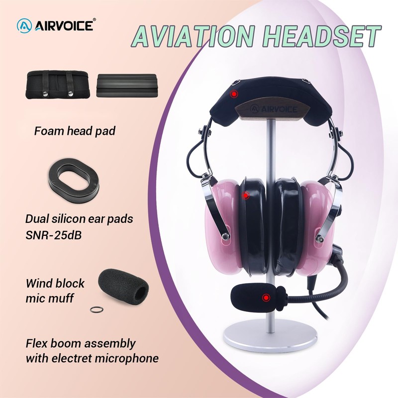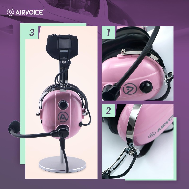 AIRVOICE Aviation Headset for Pilots with Mono Sound and Passive Noise Cancellation, PNR Aviation Headset with Comfortable Earpads and Flexible Microphone, Aviation Headset with Carrying Case, Pink